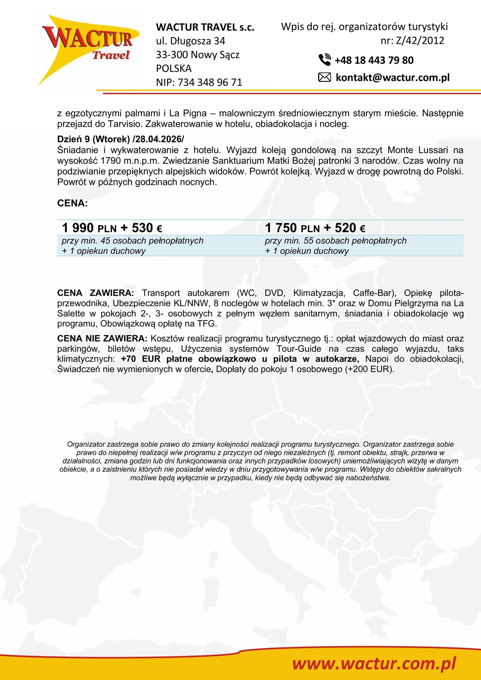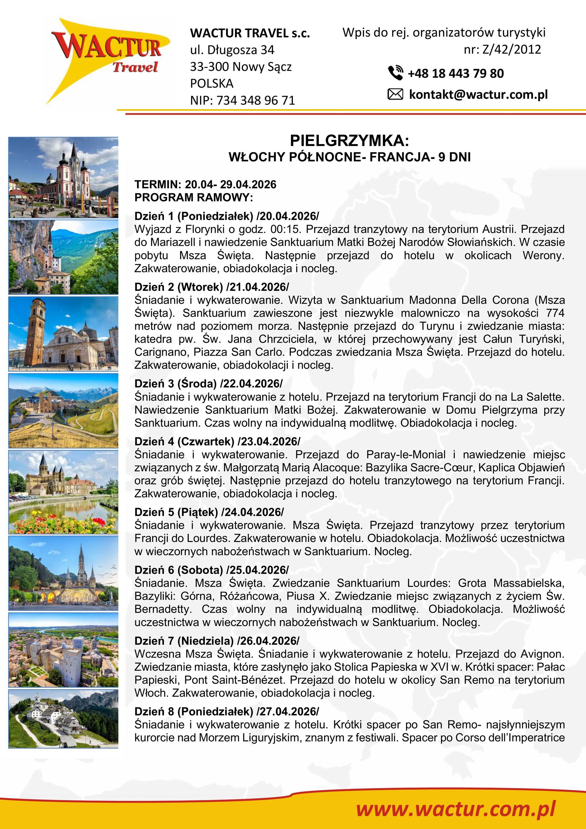 Parafia we Florynce wraz biurem podróży „Wactur Travel” z Nowego Sącza organizuje pielgrzymkę autokarową do Lourdes i innych świętych miejsc Francji i północnych Włoch w dniach 20 do 29 kwietnia 2026 zł. Szczegółowe informacje znajdziemy na tablicy ogłoszeń. Zapisy przyjmuje ks. proboszcz we Florynce pod numerem telefonu 18 447 16 70.